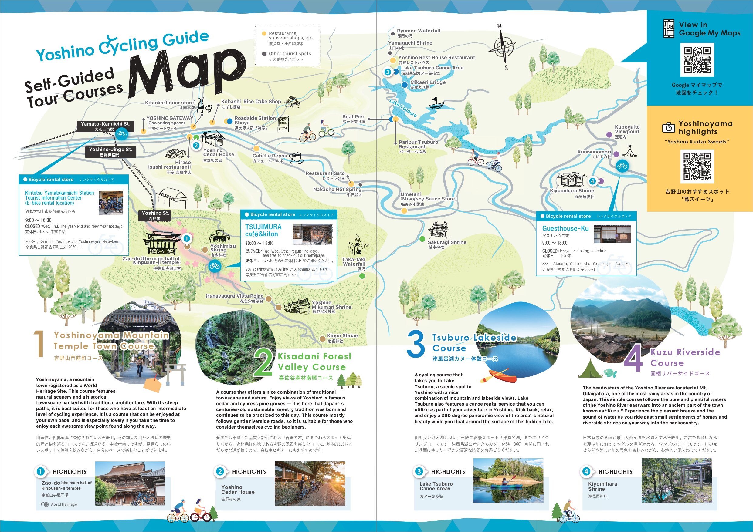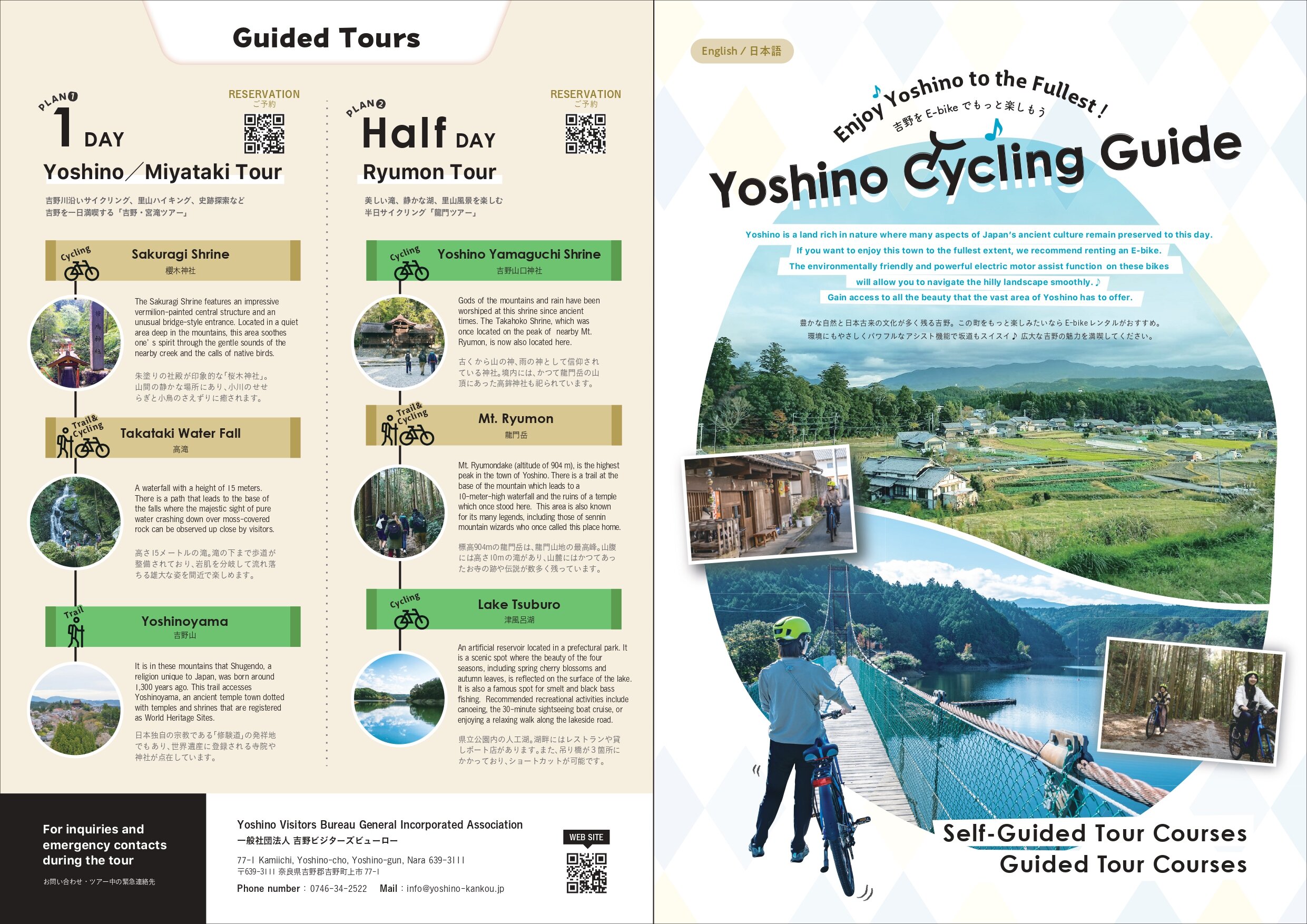 また、(株)YAMAP と連携し、吉野の歴史文化、自然等を満喫できるE-bikeで巡る周遊モデルルート及びガイドツアーを造成しましたので、エコで快適なE-bikeで歴史文化、自然豊かな「吉野」を満喫してください!